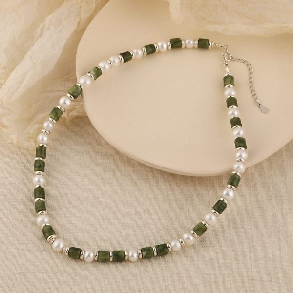 - Elegance finds its epitome in our “Emerald Column Elegance” necklace, a gorgeous and heavy piece of jewelry that seamlessly blends the charm of natural pearls with green stone columns. Between these green stone columns are sparkling natural pearls. The light and pure pearls contrast sharply with the strong, textured pillars, adding a touch of classical sophistication and timeless beauty to the necklace. The connecting parts of these metals are made of sterling silver, adding a touch of modern sophistication to the overall composition, balancing the weight of the traditional with the modern edge. Discover timeless beauty in nature and art, which leaves a lasting impression of grandeur and elegance.